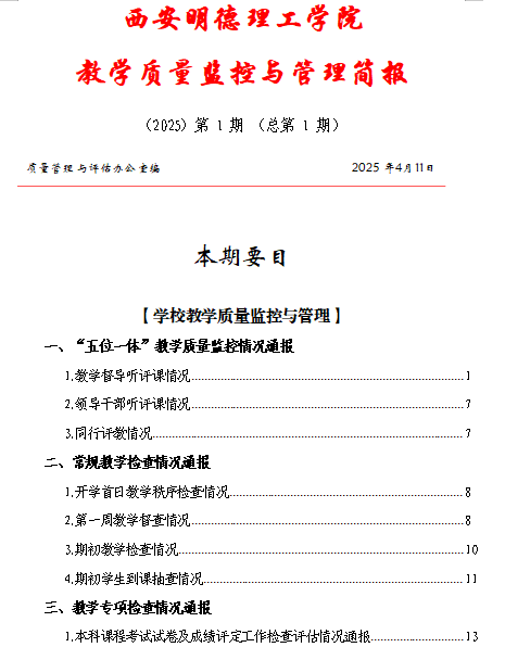 《教学质量监控与质量管理简报》按月度发布,分为校级层面和院级层面两大模块。学校层面教学质量监控与质量管理模块,主要介绍职能部门和教辅单位质量管理工作开展的实际情况。该模块由“五位一体”教学质量监控情况通报、常规教学检查情况通报、教学专项检查情况通报、教学专项评估情况通报、学校质量保障工作机构质量管理情况、“教在明德”“学在明德”品牌建设和教师培养培训等七个部分组成。二级学院层面教学质量监控与质量管理模块主要介绍各二级学院月度教学质量监控工作开展的实际情况。该模块主要展示各二级学院人才培养方案制(修)订及实施、教学基本建设、教学过程监控、教学评价、师德师风、学生学习与成长等方面的工作开展情况。