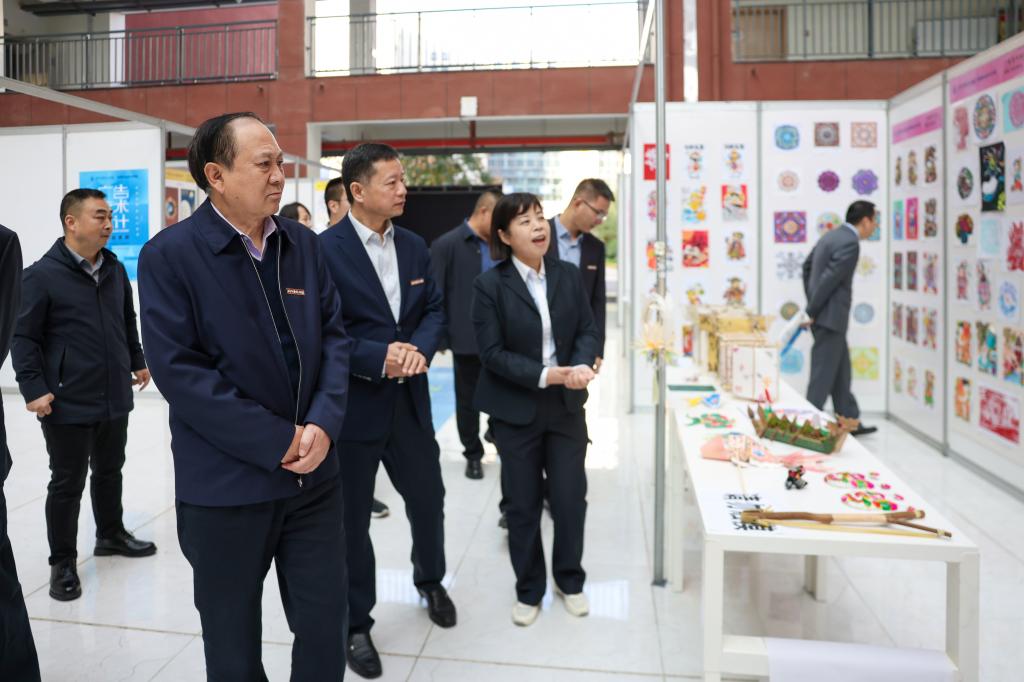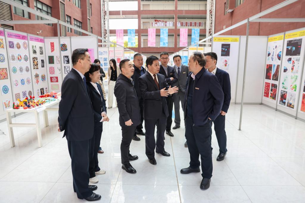 最后,全体校领导在高等职业技术学院广告艺术设计专业负责人舒粉利的带领和讲解下,近距离欣赏了专业学生们用心制作并精心布置的一块块成果展板。