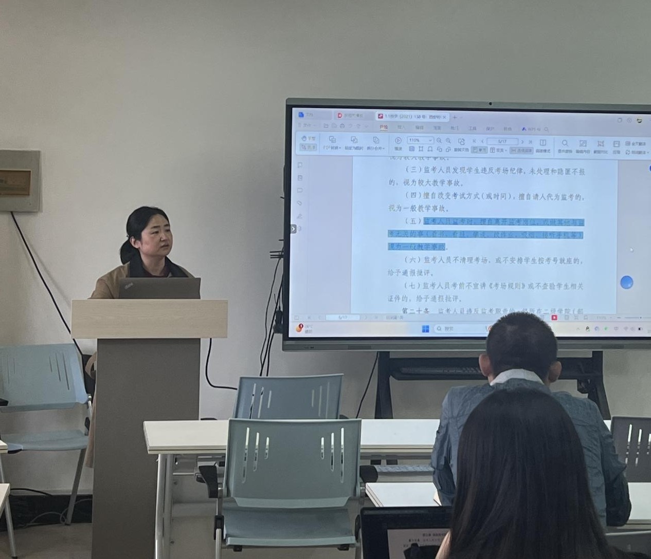 为进一步规范课程考试命题及阅卷工作,提升教师命题水平和阅卷质量,10月16日下午,高等职业技术学院副院长于莉在一号实训楼323,进行了命题及阅卷规范培训。高等职业技术学院全体专职教师、教务员参加会议。