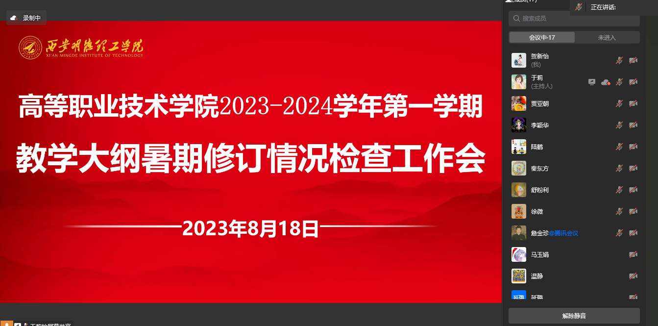 8月18日上午,高等职业技术学院开展2023-2024学年第一学期教学大纲暑期修订情况检查工作线上专项会议,与会人员有院长舒忠、党总支书记王庭良、办公室主任陆鹤、各专业负责人及相关教务人员,会议由副院长于莉主持。
