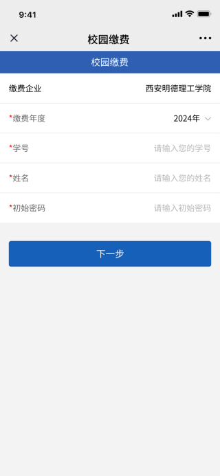 第二步:选择缴费年度、输入学号、姓名及初始密码(初始密码为身份证号后6位),完成后点击下一步。