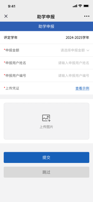 第三步:助学申报。如需申报,请选择申报金额(申报金额不可大于助学贷款额度,且不可超过学费金额)、申报用户姓名、申报用户编号、上传《国家开发银行生源地信用助学贷款受理证明》后点击“提交”,提交后一般24小时内完成审核,审核通过即可抵扣学费。如无需助学申报,直接点击“跳过”。