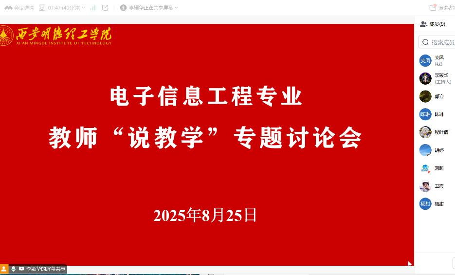 8月25日,“说教学”展示阶段在腾讯会议如期举行。专业全体教师依次登场,以脱稿或半脱稿的形式开展“说教学”展示。展示过程中,教师们重点呈现教学实践中的典型案例与关键数据,每人8分钟的展示环节亮点纷呈。展示结束后,专业从表述流畅度、内容熟练度、案例生动性、对评建问题的理解深度等方面进行讨论,提出针对性优化建议,专业教师们积极参与现场交流补充,营造出互学互鉴、共同进步的良好互动氛围。
