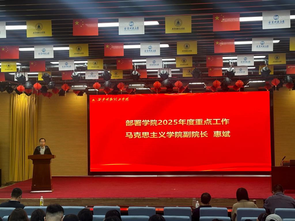 惠斌副院长对马克思主义学院2025年度重点工作进行部署。他指出,马克思主义学院将重点围绕“教育教学创新、师资能力提升、学术科研突破、实践育人增效”四大核心工作,着力构建“三全育人”新格局。通过打造教育教学“金课群”,构建教师发展“培养链”,需求牵引学术科研,构建“三位一体”实践育人体系四个层面,实现育人全方位、全过程、全员化。