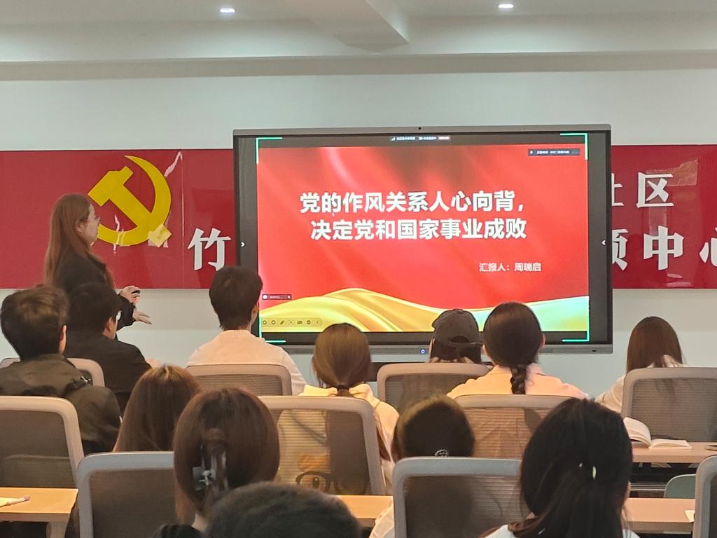 交流环节,支部党员周瑞启、张丹、阎泓锦3人作了分享。周瑞启围绕“党的作风问题关系人心向背,决定党和国家事业成败”的主题进行分享,她谈到,党的作风是党的形象,基层党组织加强党的作风建设至关重要。张丹从党员如何加强作风建设展开分享,作风建设这门“必修课”融入党员教育日常、抓在经常,永葆党的先进性。阎泓锦从学生党员如何在学院“学在明德”学风建设中发挥示范引领作用进行分享,她谈到,作为学生党员,带头践行学校“勤学善思、知行合一”的学风,努力营造良好学习氛围,继续擦亮学风建设品牌,在学校本科教学工作合格评估中贡献青春力量。与会同学纷纷表示,在今后的学习和生活中,将以更高的标准、更严的要求约束自己,努力将学习成果转化为实际行动,以良好的作风展现新时代大学生党员风采。