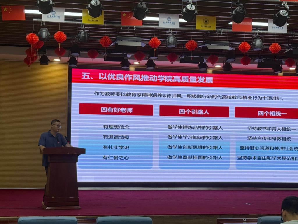 会上,王君涛先从中央八项规定出台的背景、主要内容,以及中央八项规定精神的实质和违反的主要表现等三个方面进行了深入讲解,并为全体教职工深入阐述了开展学习教育的意义以及如何以优良作风推动学院高质量发展。王君涛结合学院实际,提出了要以优良作风推动学院高质量发展的建议。他指出,以党的创新理论武装头脑,积极践行群众路线,发挥领导干部的头雁效应,建立监督检查长效机制等四个方面是加强作风建设的主要路径和方法。他还强调,作为教师,要以教育家精神涵养师德师风,积极践行新时代高校教师职业行为十项准则。